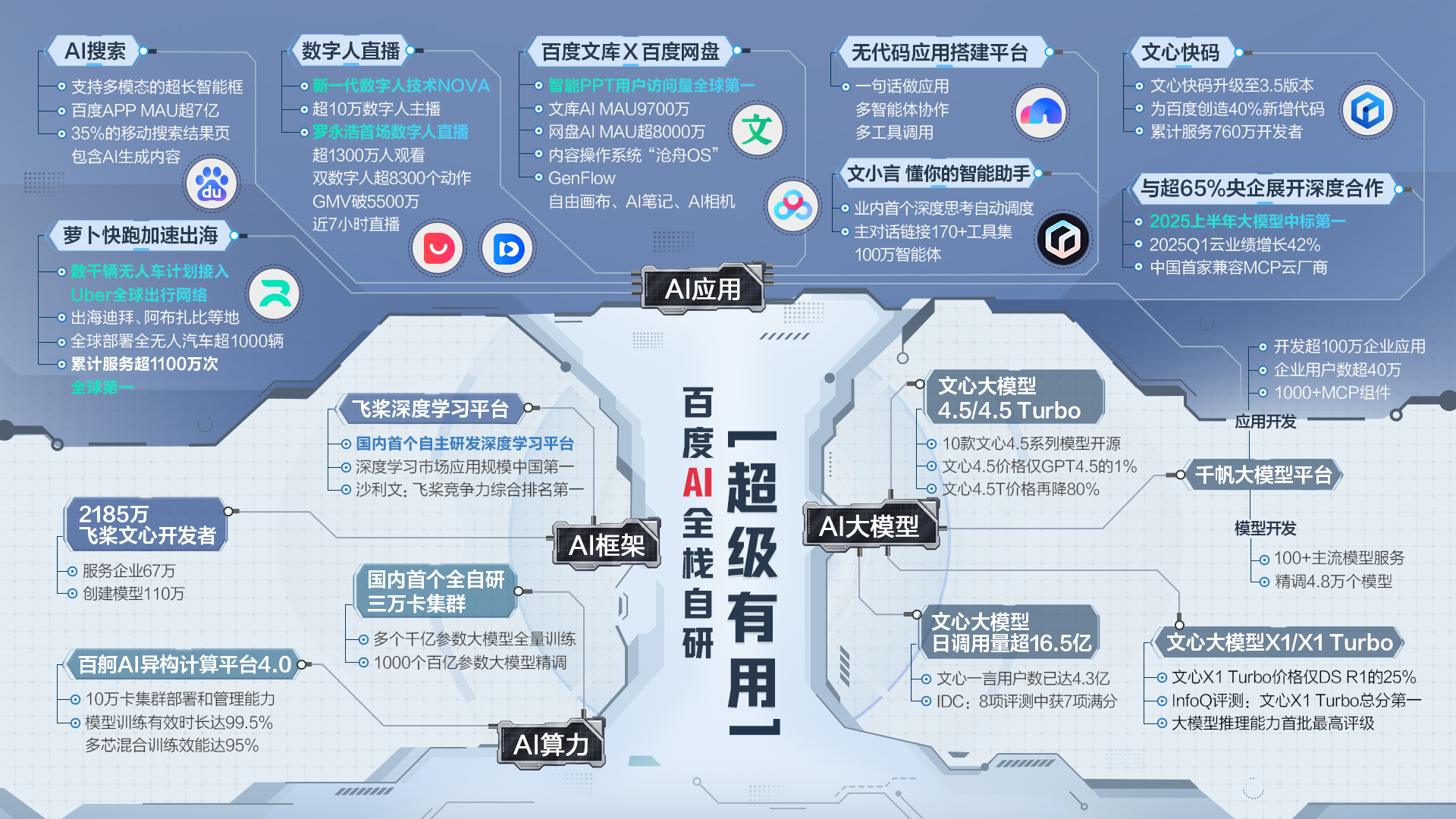 该集群依托百舸平台,办事了67万家企业,百度正在此次WAIC大会上还展出多款焦点AI产物和手艺。萝卜快跑颁布发表取Uber合做,该手艺曾支持罗永浩数字人曲播间创下5500万GMV,建立了110万个模子。还担任了本届WAIC的大会接驳车。正在7月26日揭幕的世界人工智能大会(WAIC)上,本年以来,百度慧播星还发布了新一代数字人手艺NOVA。文心大模子4.5系列10款模子正式开源。支撑1000个客户同时做百亿参数的大模子精调。大规模、高并发模子推理速度能够提崇高高贵40%。飞桨文心开辟者数量已达2185万,本年以来,截至2025年4月,百度智能云点亮了自研3万卡级超大规模计较集群,截至本年5月,单卡吞吐机能比拟国内支流芯片方案能够超出跨越90%,百度慧播星发布新一代数字人手艺NOVA!